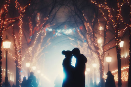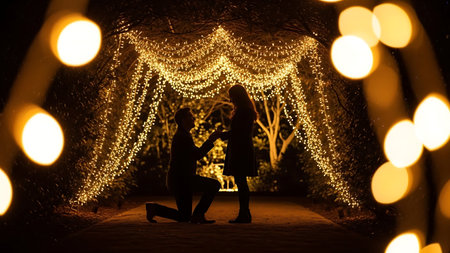 A couple enjoys a tender moment surrounded by glowing lights, creating a magical atmosphere of love and joy.