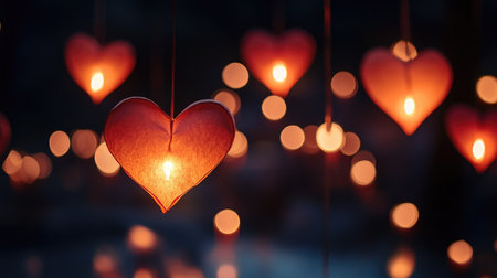 Floating paper lanterns in the shape of hearts, representing romantic celebrations. No people, room for message