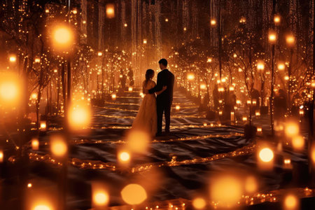 bride and groom holding hands at night surrounded by bright light, in the style of imaginative fantasy landscapes. Generative AI