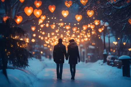 Couple holding hands and walking under heart-shaped lanterns in magical winter night