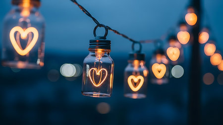 Decorative string lights featuring glass jars with heart-shaped glowing filaments hanging outdoors during twilight with blue bokeh.