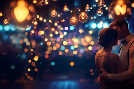 A couple enjoys a romantic moment while dancing under bright lights, creating a magical atmosphere.