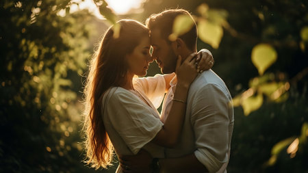 Couple embracing in a garden with blooming flowers background, during golden hour