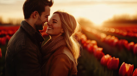 A couple embraces each other with joy, surrounded by rows of blooming red tulips as the sun sets in the background, creating a warm, romantic atmosphere.