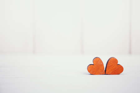 Valentines day two red hearts on white wooden background. Holidays card with copy space.