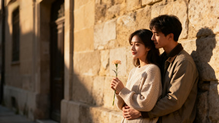 Young asian couple in love walking in the old town with flower