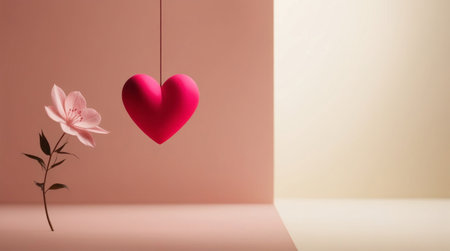 A red heart hangs from a string beside a lovely flower
