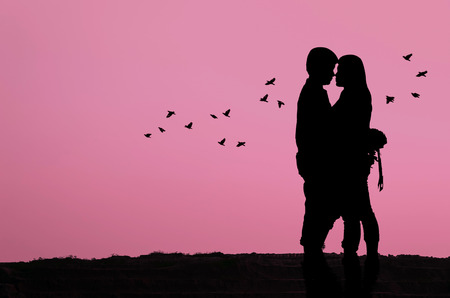 Silhouette of a loving couple in love at sunset background.