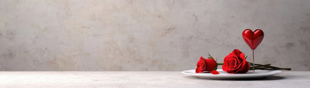This image captures a beautiful romantic setup featuring red roses and a heart on a white plate. Ideal for expressing love and affection.