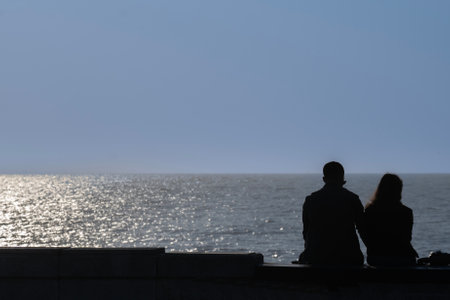 Silhouette of couple in love sitting under rain on the beach