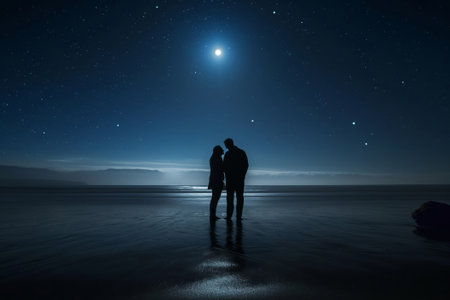 Silhouette of a couple embracing on the beach under a starry night sky with a bright moon