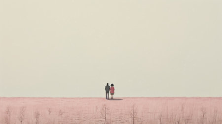 Two individuals hold hands as they stroll along a path surrounded by a soft fog. A vibrant red tree and a heart shape add a romantic touch to the serene atmosphere.