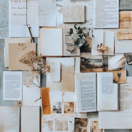 Neatly arranged collection features handwritten notes, dried flowers, and various textured papers in soft neutral tones, creating an artistic display.