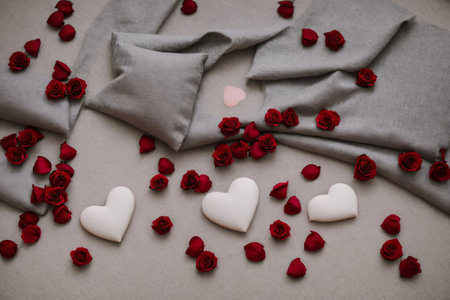 Valentine's Day background with red roses and hearts on gray fabric