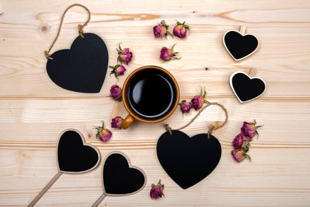 Black plate for text, coffee, dried flowers, roses