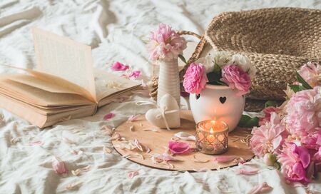 Still life details in home interior of living room. Candle and Vase with roses and peonies flowers and spring decor on the books. Read, Rest. Cozy spring concept.