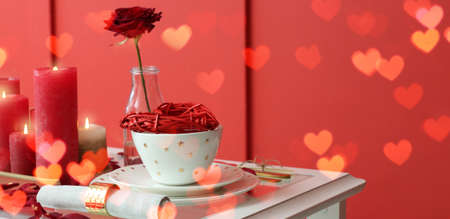 Festive table setting for Valentines Day celebration at home