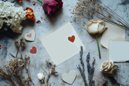 Overhead view of a romantic handwritten letter with dried flowers, hearts, and other decorative elements creating a vintage and sentimental atmosphere