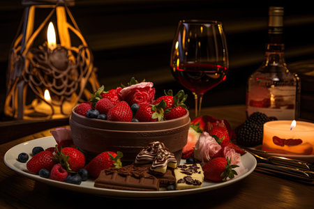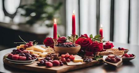 A romantic, candlelit setting, showcasing a bottle of red wine, accompanied by two wine glasses, a charcuterie board, and a bouquet of roses. Perfect ambiance for a romantic evening. Generative AI