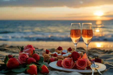 Romantic picnic by the seashore features glasses of champagne, strawberries, roses, honeymoon