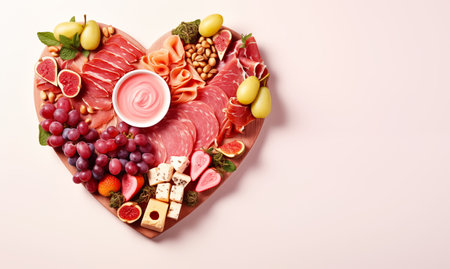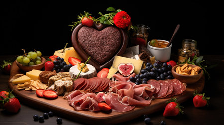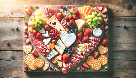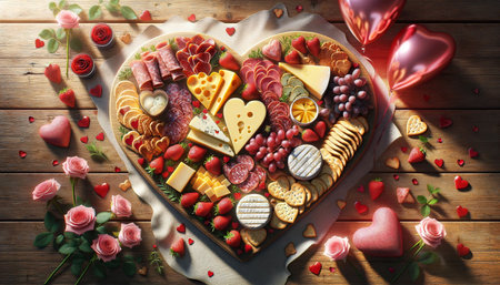 Heart-shaped board overflows with an inviting selection of cheeses, cured meats, fresh fruits, and crackers, surrounded by scattered red hearts, symbolizing a feast of love.