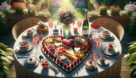 diorama of an elegant setup of heart-shaped charcuterie boards with an assortment of cheeses, cured meats, and fresh fruits, romantic culinary experience for Valentine's Day