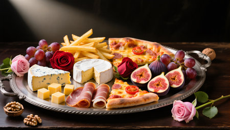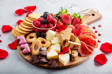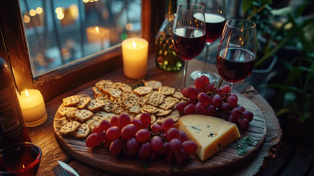 Valentine's day Aperitif, Heart-Shaped Cheese and Crackers Platter with Red Grape Accents