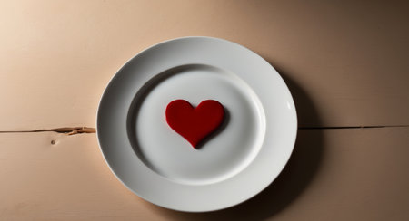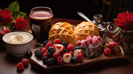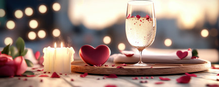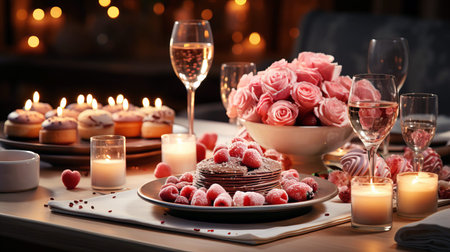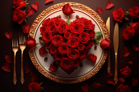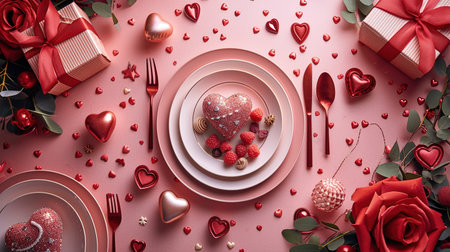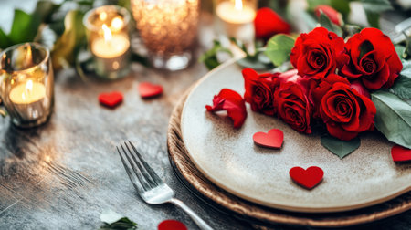 This captivating image showcases a romantic dinner setting featuring red roses and heart decorations, perfect for celebrations of love and affection.
