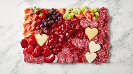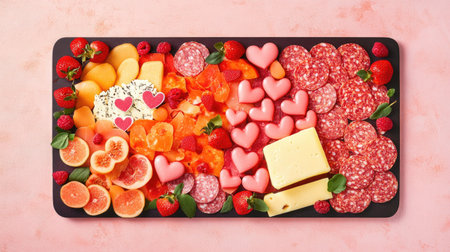 A vibrant charcuterie board featuring an array of fruits, cheeses, and heart-shaped treats. Perfect for celebrations, picnics, and gatherings.