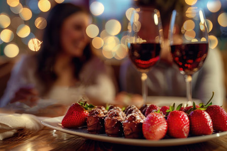 Two glasses of wine and a plate of strawberries with chocolates in front of a couple with bokeh lights