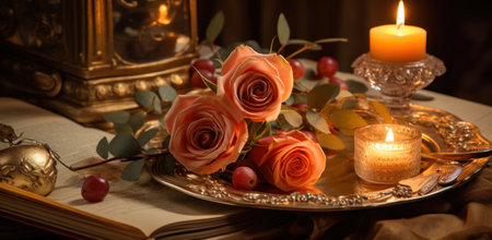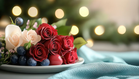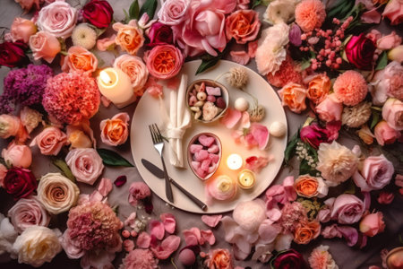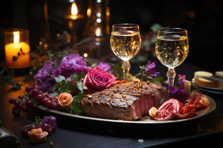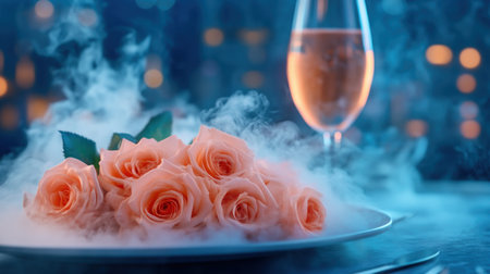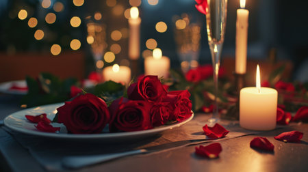 Escape into romance with an intimate dinner featuring exquisite roses and gourmet delights This perfect setting, ideal for anniversaries, combines fine dining with floral artistry for an unforgettable evening Celebrate your bond with captivating flavors and elegant blooms, creating cherished memories It's the perfect romantic dinner experience AI Generative