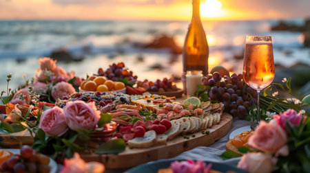 Elegant Sunset Picnic Featuring Assorted Fruits, Charcuterie, and Sparkling Drink by the Ocean
