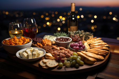 Antipasto at a roof party in Naples, with panoramic views of the city at night., generative AI