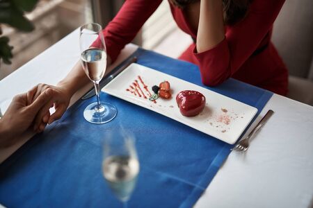 Couple celebrating Valentine's Day with cake and candles. Focus on cake