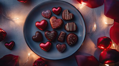 A flat lay of a Valentine chocolate set with various chocolate designs, including heart-shaped and personalized chocolates, placed on a romantic table with soft lighting