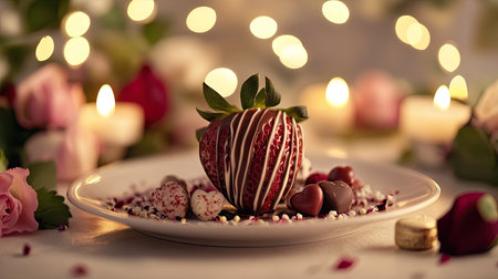 A Valentine chocolate strawberry plate with delicate drizzle designs, surrounded by fresh flowers, candles, and soft-focus bokeh lighting for a romantic atmosphere