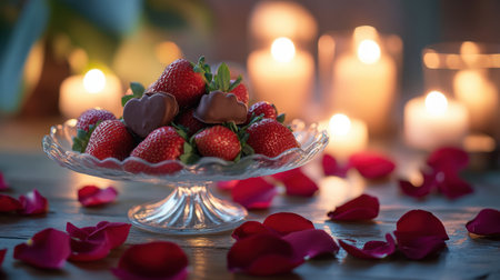 A romantic scene with Valentine chocolate strawberries arranged on a glass plate, surrounded by rose petals and soft candlelight.