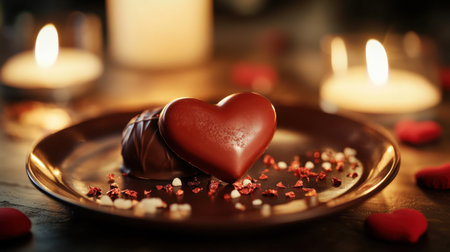 A delicate Valentine chocolate truffle in a heart-shaped box, resting on a polished plate with soft candlelight illuminating the scene.