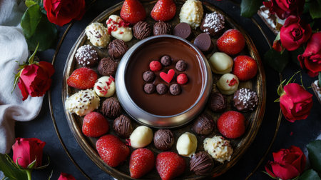 A themed Valentine chocolate platter featuring dipped fruits, truffles, and a chocolate fondue pot in the center, surrounded by roses.