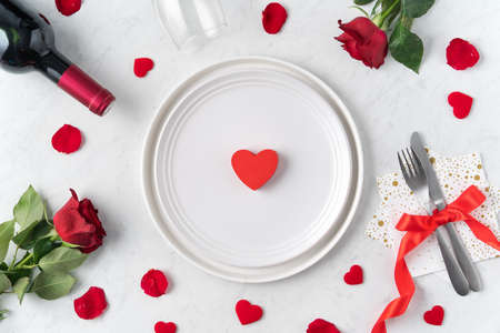 White plate with red rose flower on marble white table background for Valentine's Day dating holiday meal concept.