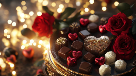 Rich, handcrafted chocolates arranged in a romantic setting with sparkling lights and floral accents for a luxurious Valentine treat.