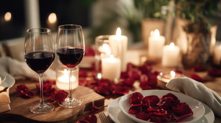 A beautifully arranged romantic dinner scene featuring two glasses of red wine, scattered rose petals, and glowing candles, creating an inviting atmosphere.