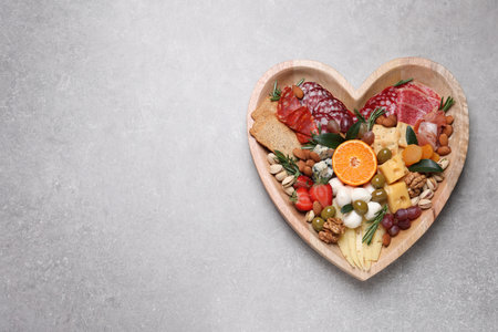 Heart shaped plate with different delicious snacks on grey table, top view. Space for text