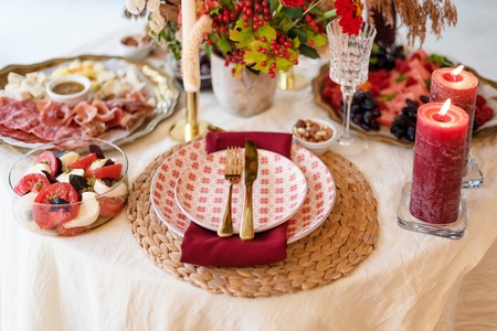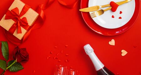 Romantic dinner for Valentine's day on a red background. Selective focus. Holiday.