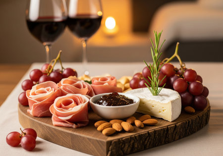 Gourmet charcuterie board with prosciutto roses brie cheese grapes and red wine for a romantic date night. An elegant appetizer for two.