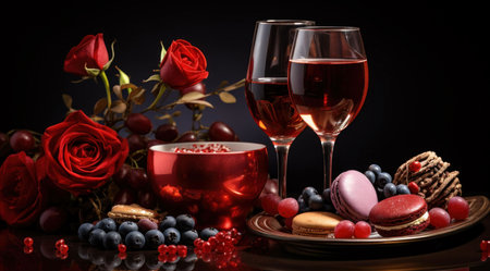 Romantic dinner with wine, macaroons and roses on bed. generative ai