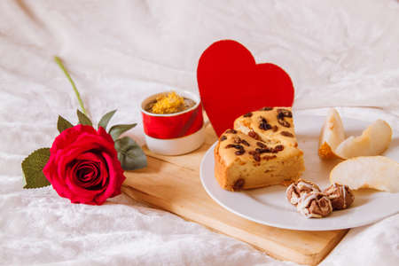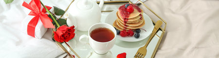 Tray with tasty breakfast, rose flower and gift on bed. Valentine's Day celebration