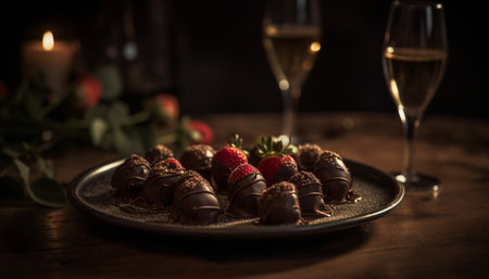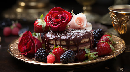 Indulgent gourmet dessert plate with dark chocolate and fresh berries generated by artificial intelligence