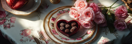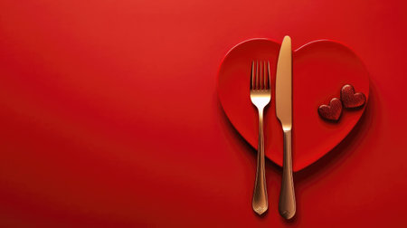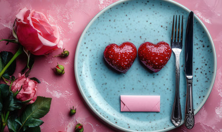 Love-infused table setting for Valentine's Day with heart-shaped sweets, elegant red cutlery, and roses, creating a romantic dining experience.