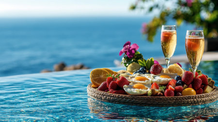 Indulge in a luxurious breakfast spread featuring fresh fruits, eggs, and champagne, elegantly arranged by an infinity pool with a stunning ocean view, creating a serene atmosphere perfect for relaxation.